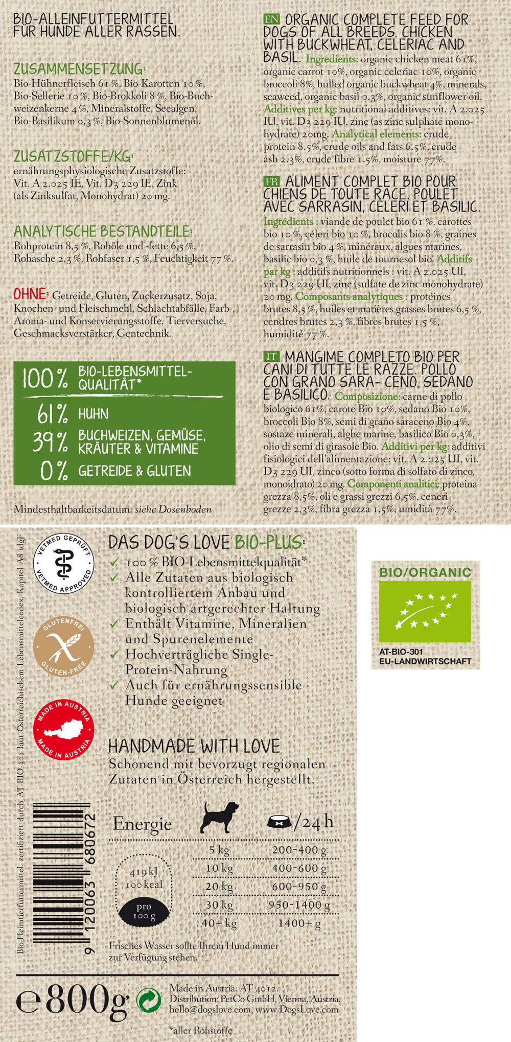 Bio Hundefutter Huhn mit Buchweizen, Sellerie, Basilikum 800g Dog's Love