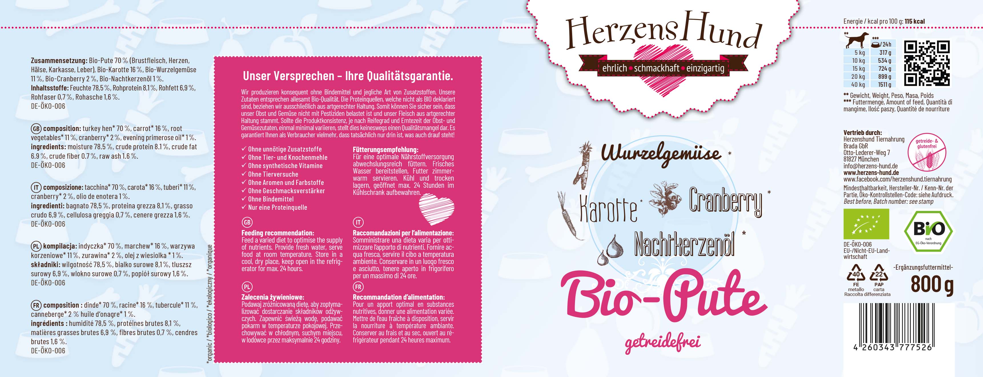 Hunde Ergänzungsfutter Bio Pute, Karotte getreidefr. 800g HerzensHund - Bild 1