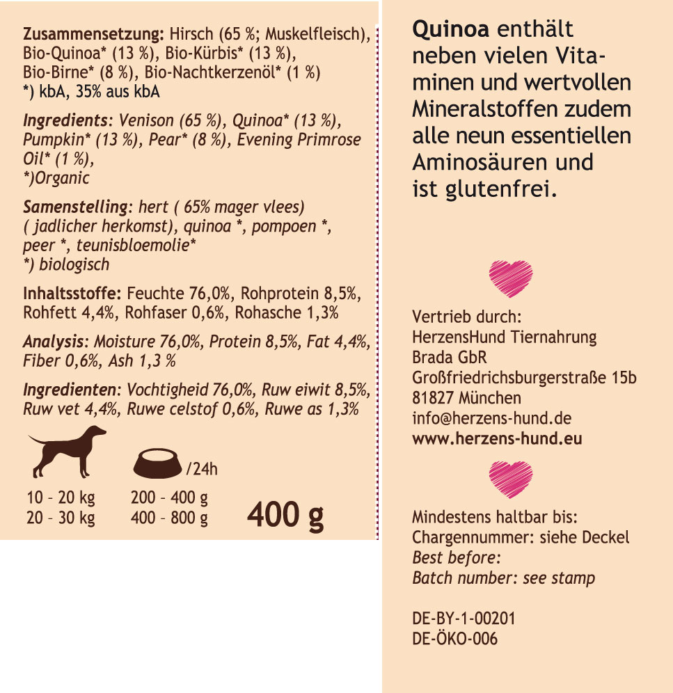 Bio Ergänzungsfutter Hund Hirsch (Nicht Bio), Kürbis, Birne, Quinoa 400g Herzens - Bild 1Bio Ergänzungsfutter Hund Hirsch (Nicht Bio), Kürbis, Birne, Quinoa 400g Herzens - Bild 2