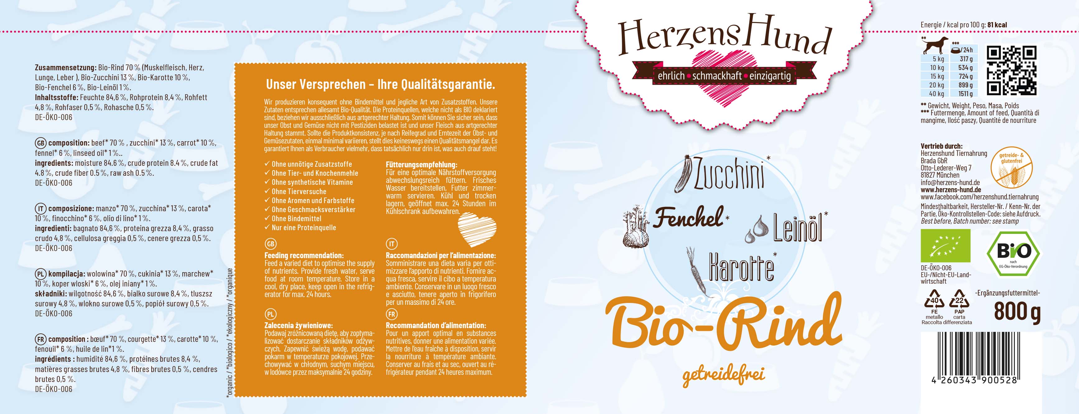 Hunde Ergänzungsfutter Bio Rind, Zucchini getreidefr. 800g HerzensHund - Bild 1