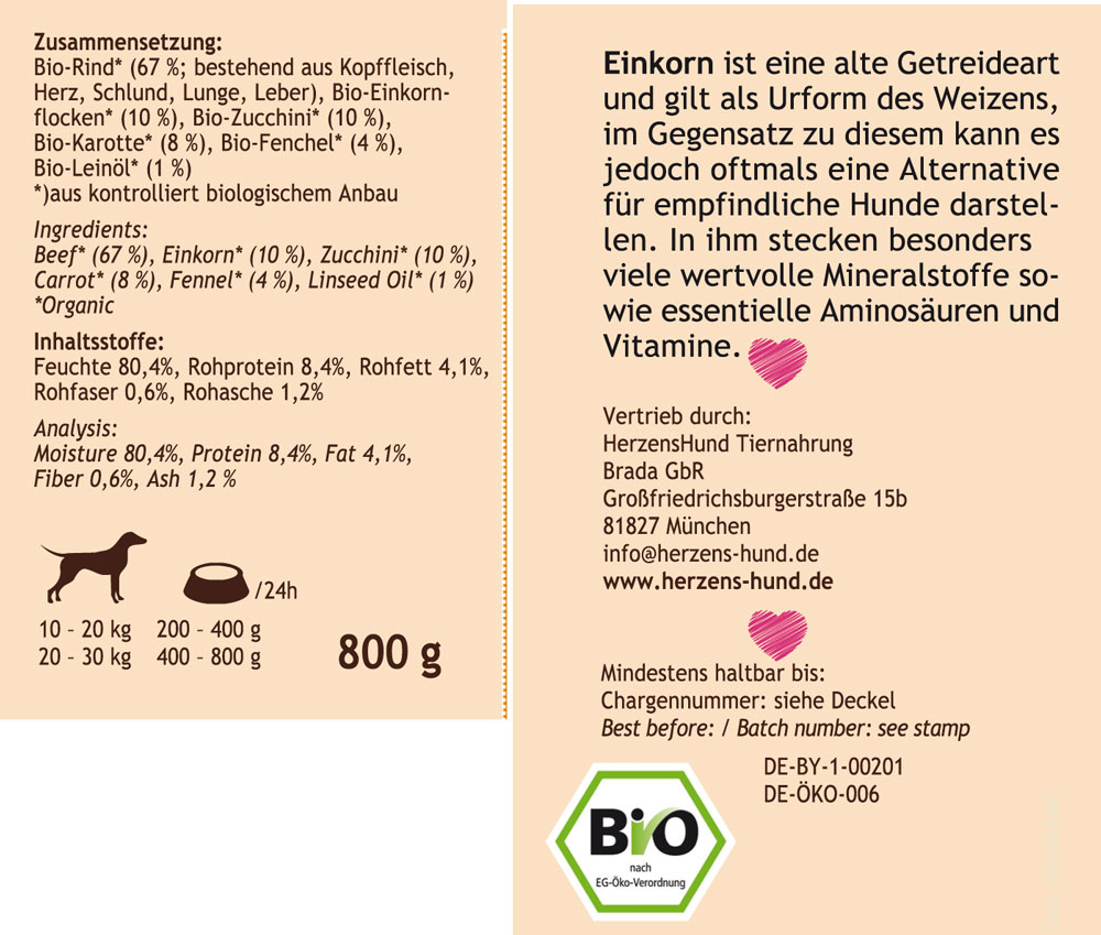 Rind, Einkorn Bio Ergänzungsfutter Hund 800g HerzensHund - Bild 1Rind, Einkorn Bio Ergänzungsfutter Hund 800g HerzensHund - Bild 2