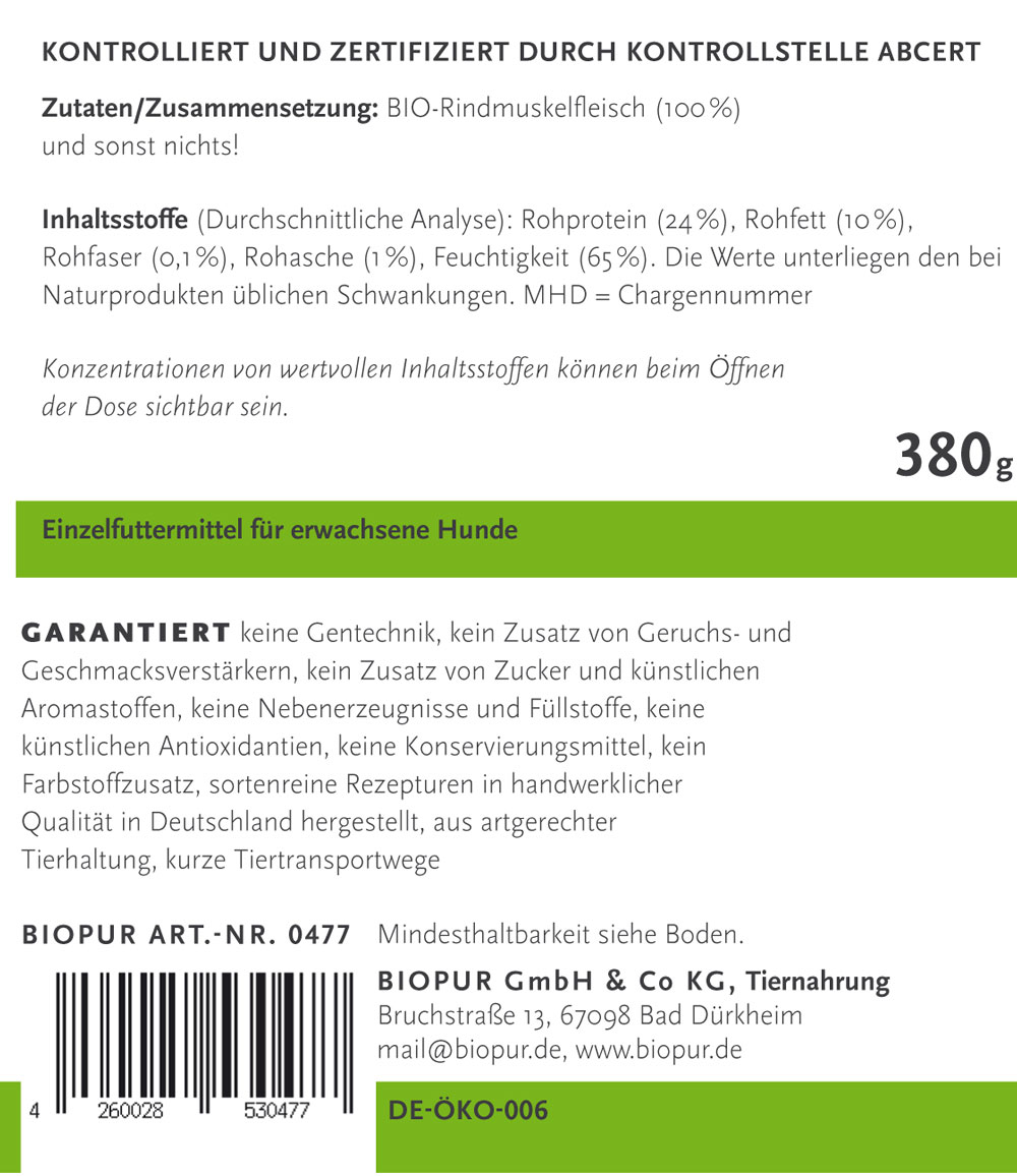 Rindmuskelfleisch in eigenen Saft gegart 380g BIOPUR Bio Ergänzungsfutter Hund - Bild 1