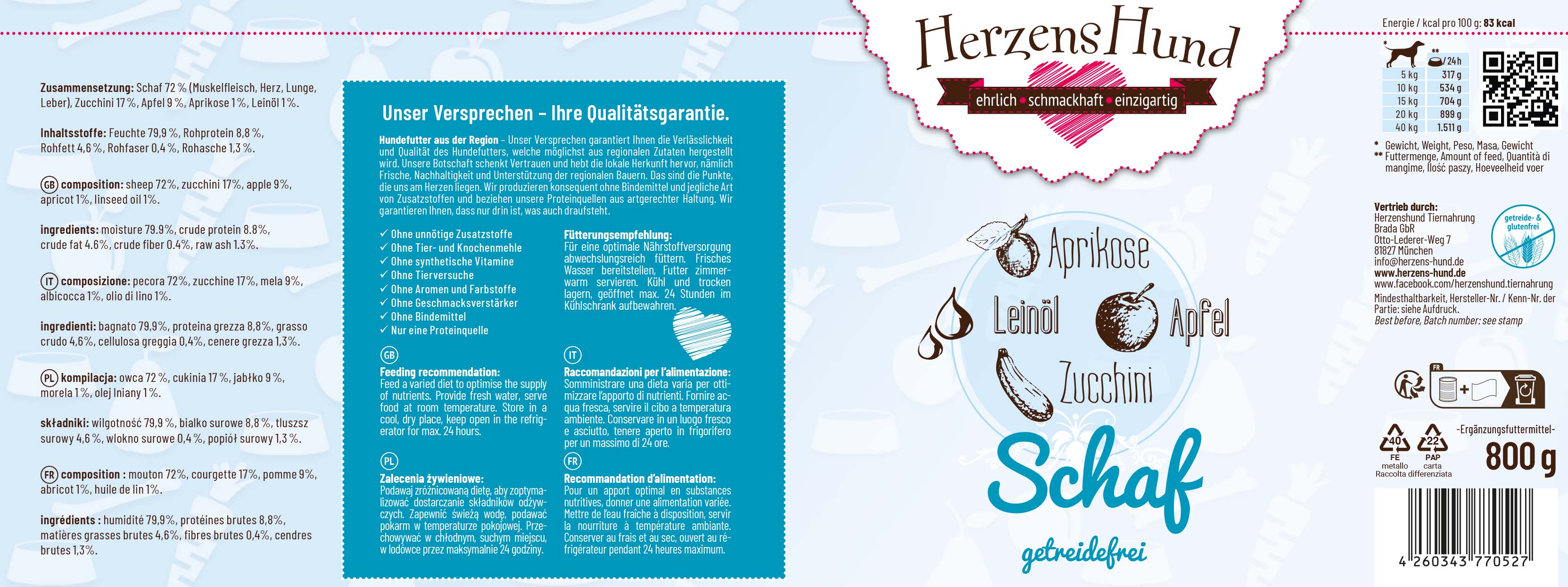Hunde Ergänzungsfutter Schaf NICHT BIO, Apfel getreidefr. 800g HerzensHund - Bild 1
