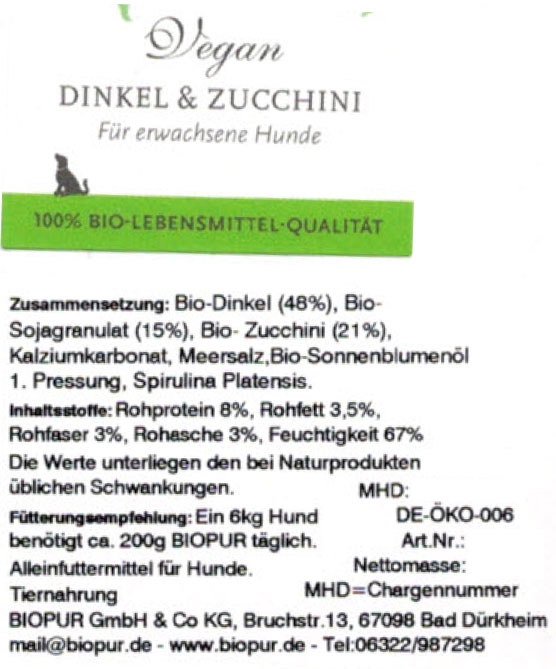 Bio Hundefutter Vegan Dinkel, Zucchini im GLAS! 100g BIOPUR - Bild 1