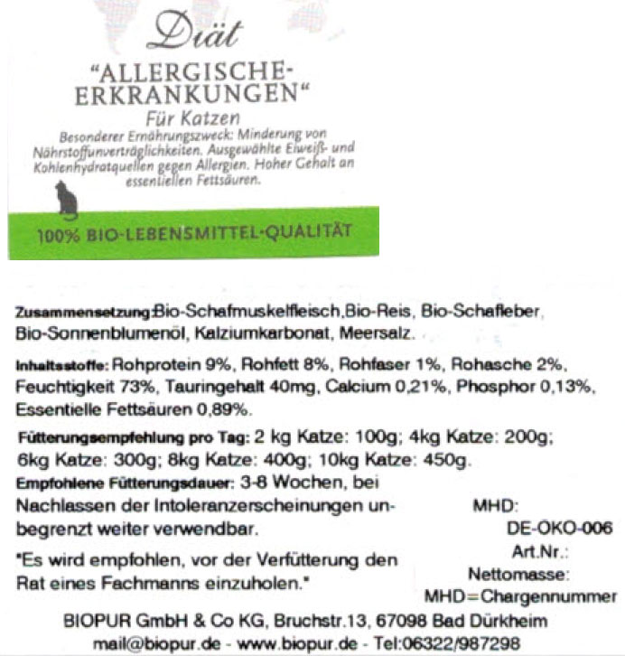 Bio Katzendiätfutter Allergische Erkrankungen im GLAS! 100g BIOPUR
