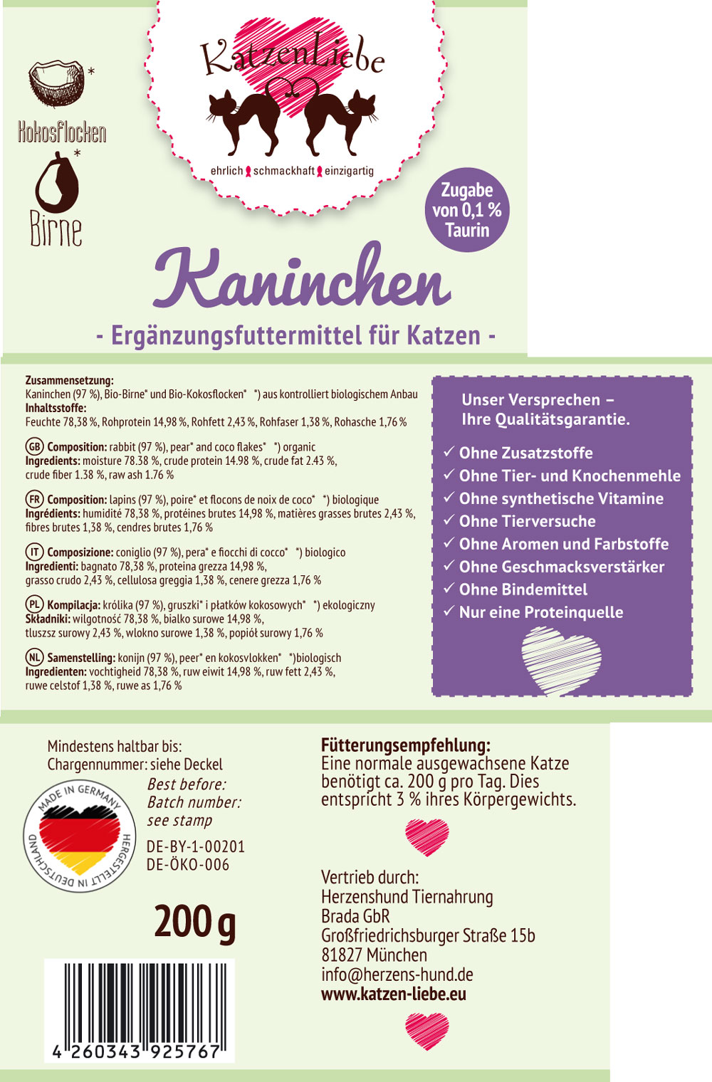 Katze Ergänzungsfutter Kaninchen (Nicht Bio) Birne, Kokosfl. 100g Katzenliebe - Bild 2